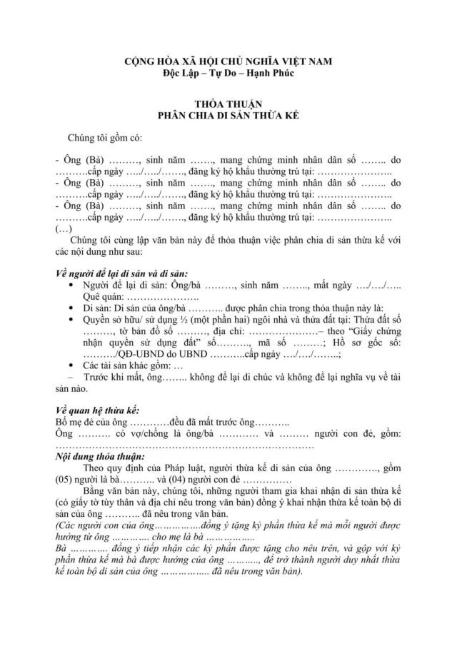 Trong trường hợp chia theo pháp luật, các bên có thể tự soạn thảo bản dự kiến phân chia. Bản Đồ Số Sài Gòn thường hỗ trợ khách hàng rà soát các điều khoản trong dự thảo này để đảm bảo không vi phạm điều cấm của luật và bảo vệ quyền lợi cho tất cả các bên.